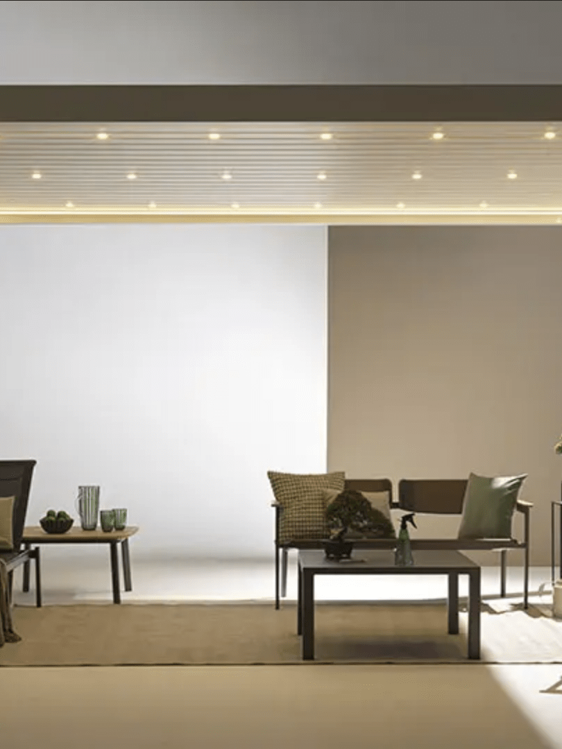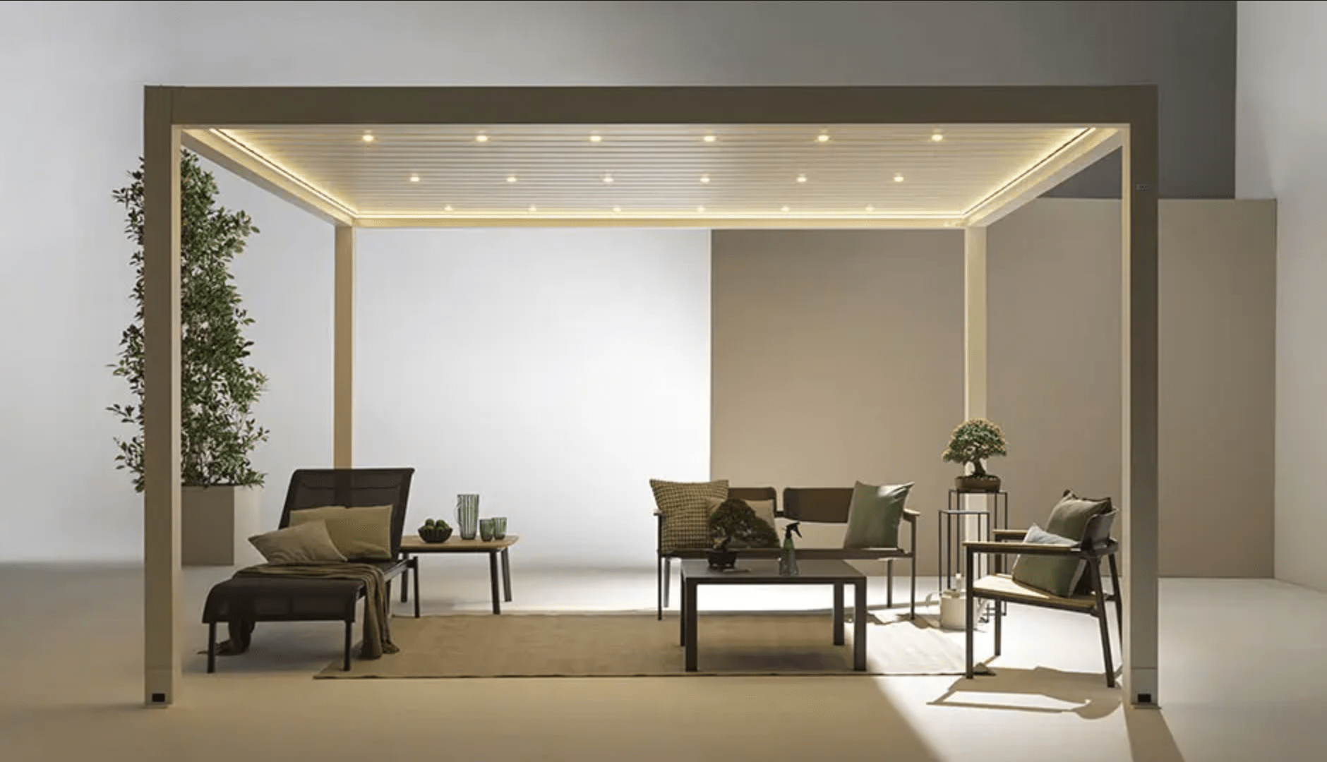 Optional können LED-Spots in die Lamellen integriert oder umlaufende RGB-LED-Strips angebracht werden. Diese sorgen für eine stimmungsvolle Atmosphäre und machen den Außenbereich auch bei Dunkelheit nutzbar.
