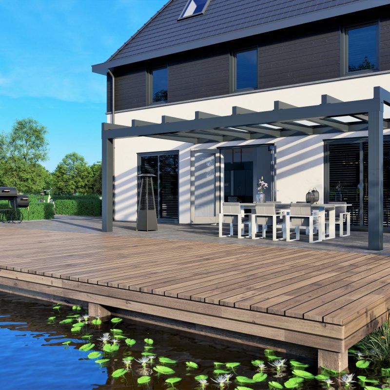 Das einzigartige Design macht diese Überdachung zu einem Blickfang. Trotz ihrer Stärke ist diese Ultraline schlank und minimalistisch. Alternativ ist eine Montage mit schmaleren Pfosten möglich.