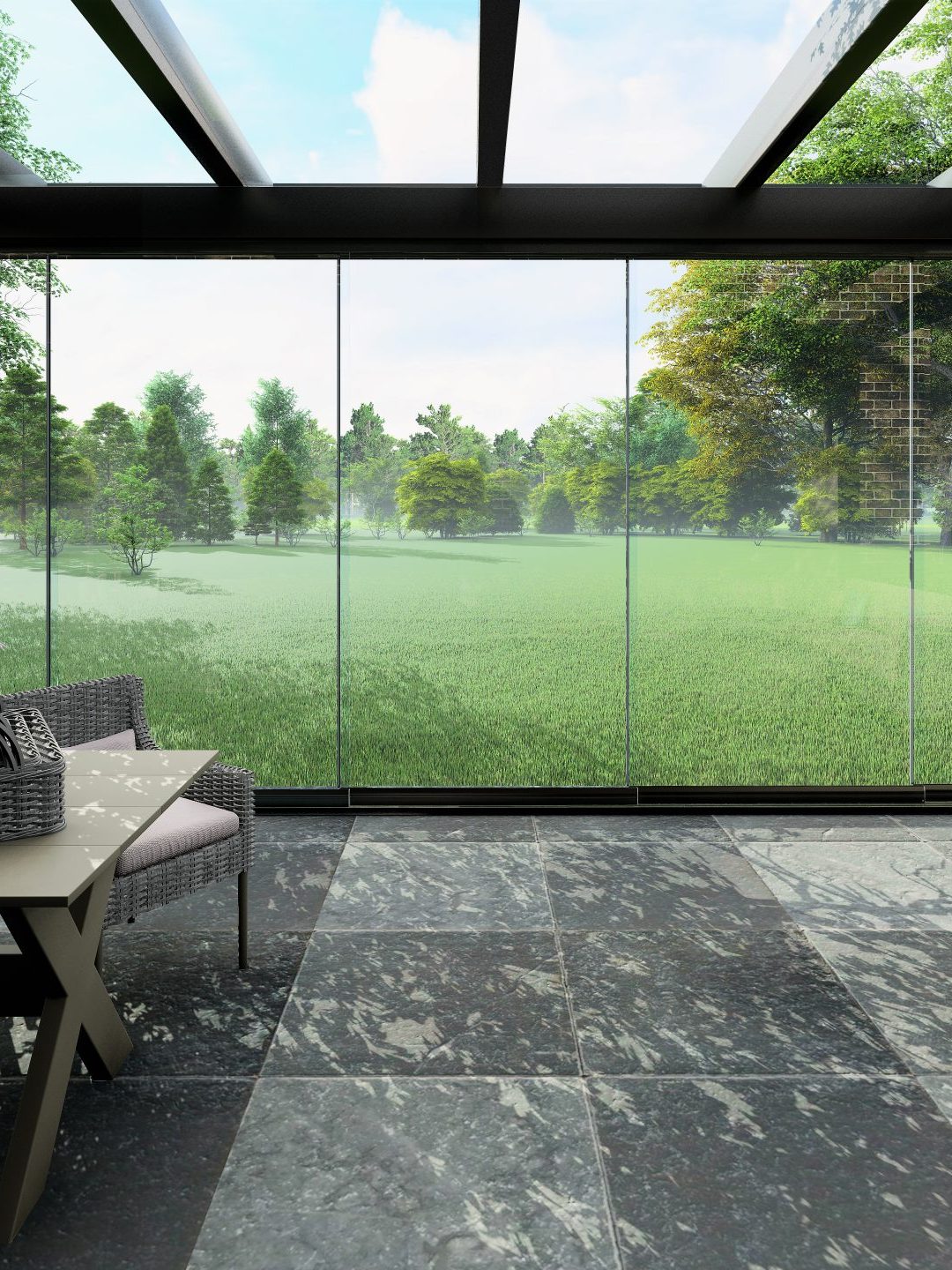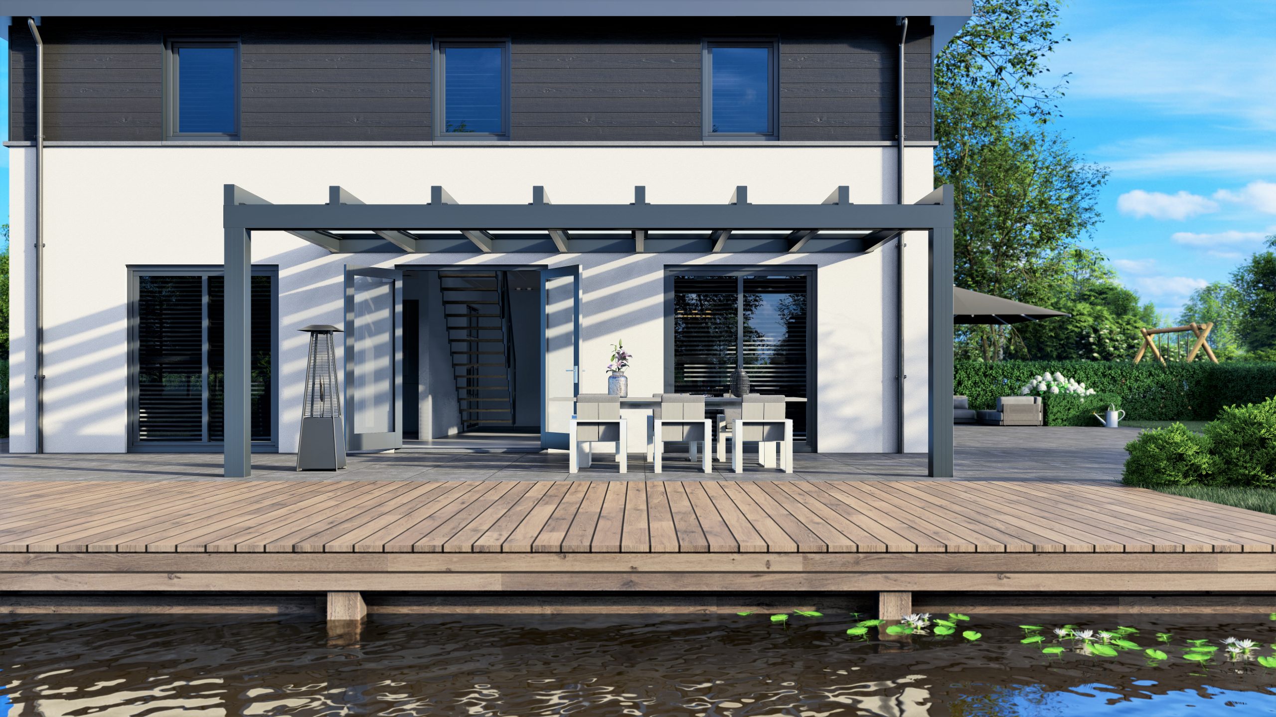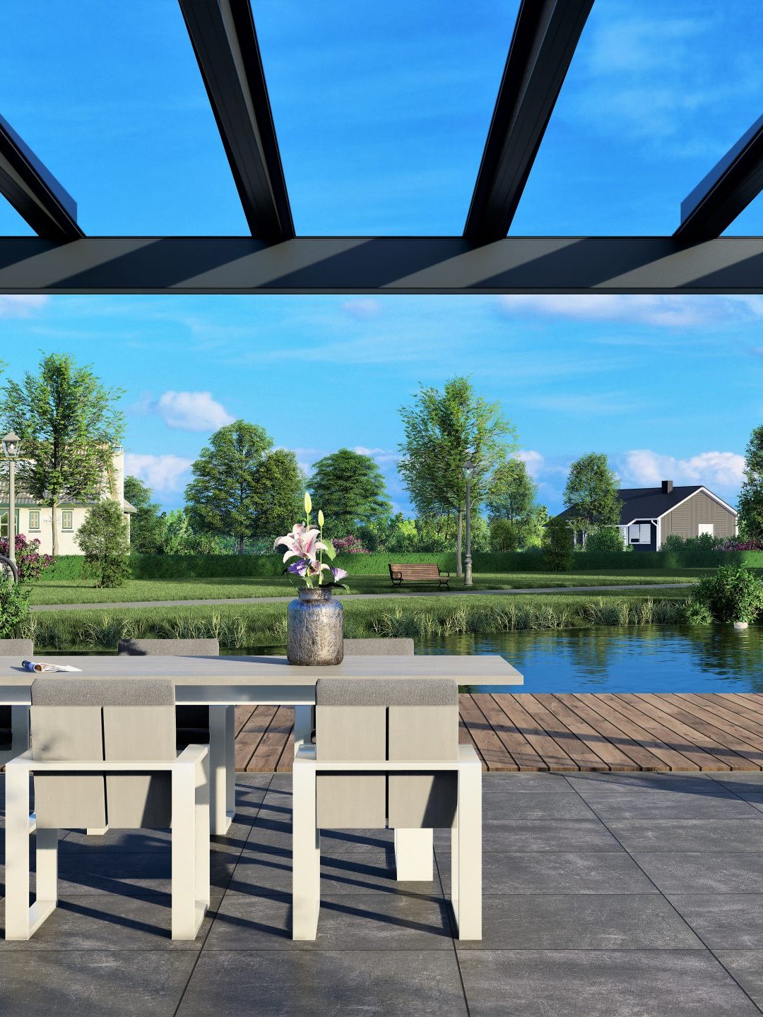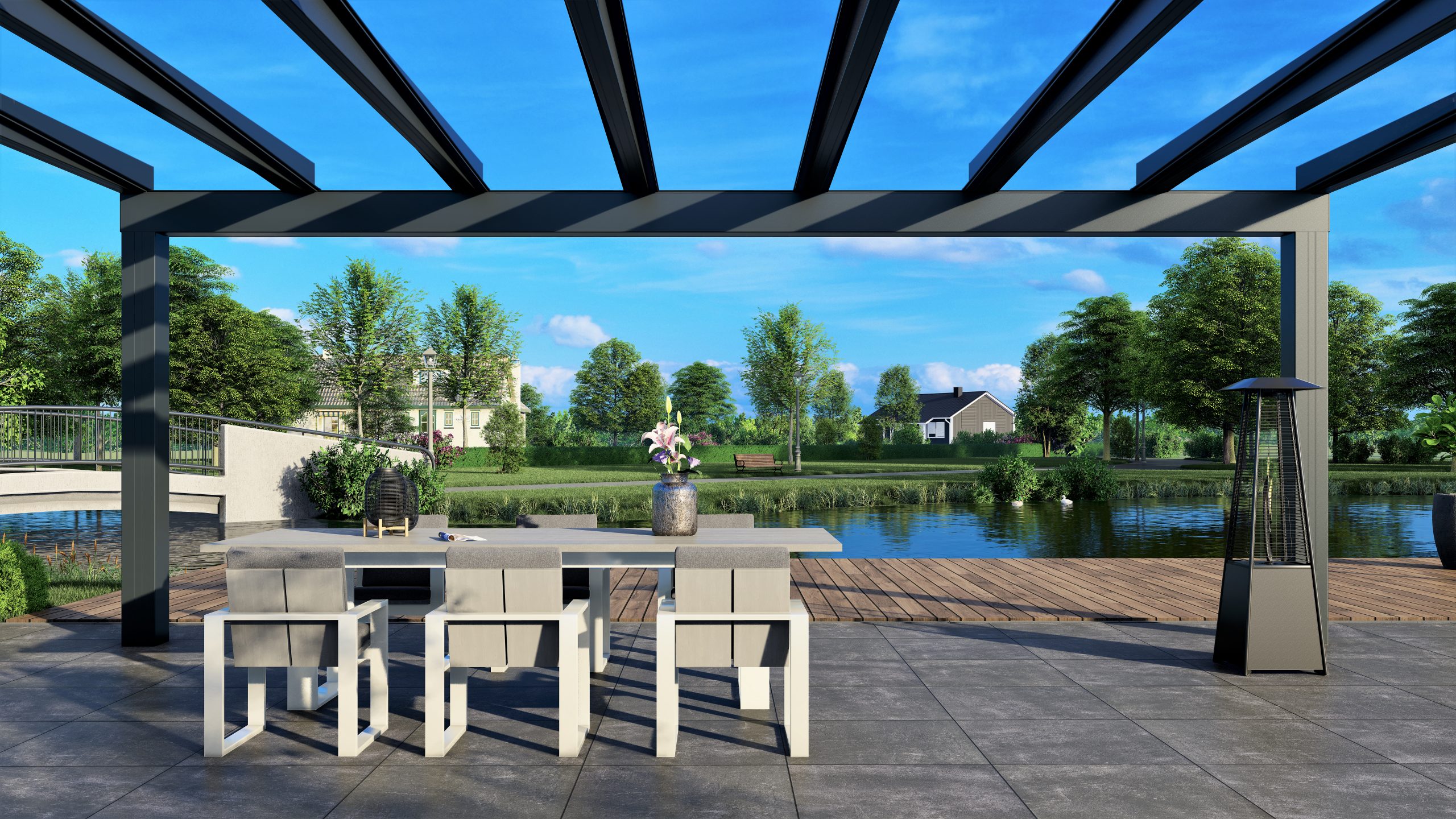 Das einzigartige Design macht diese Überdachung zu einem Blickfang. Trotz ihrer Stärke ist diese Ultraline schlank und minimalistisch. Alternativ ist eine Montage mit schmaleren Pfosten möglich.